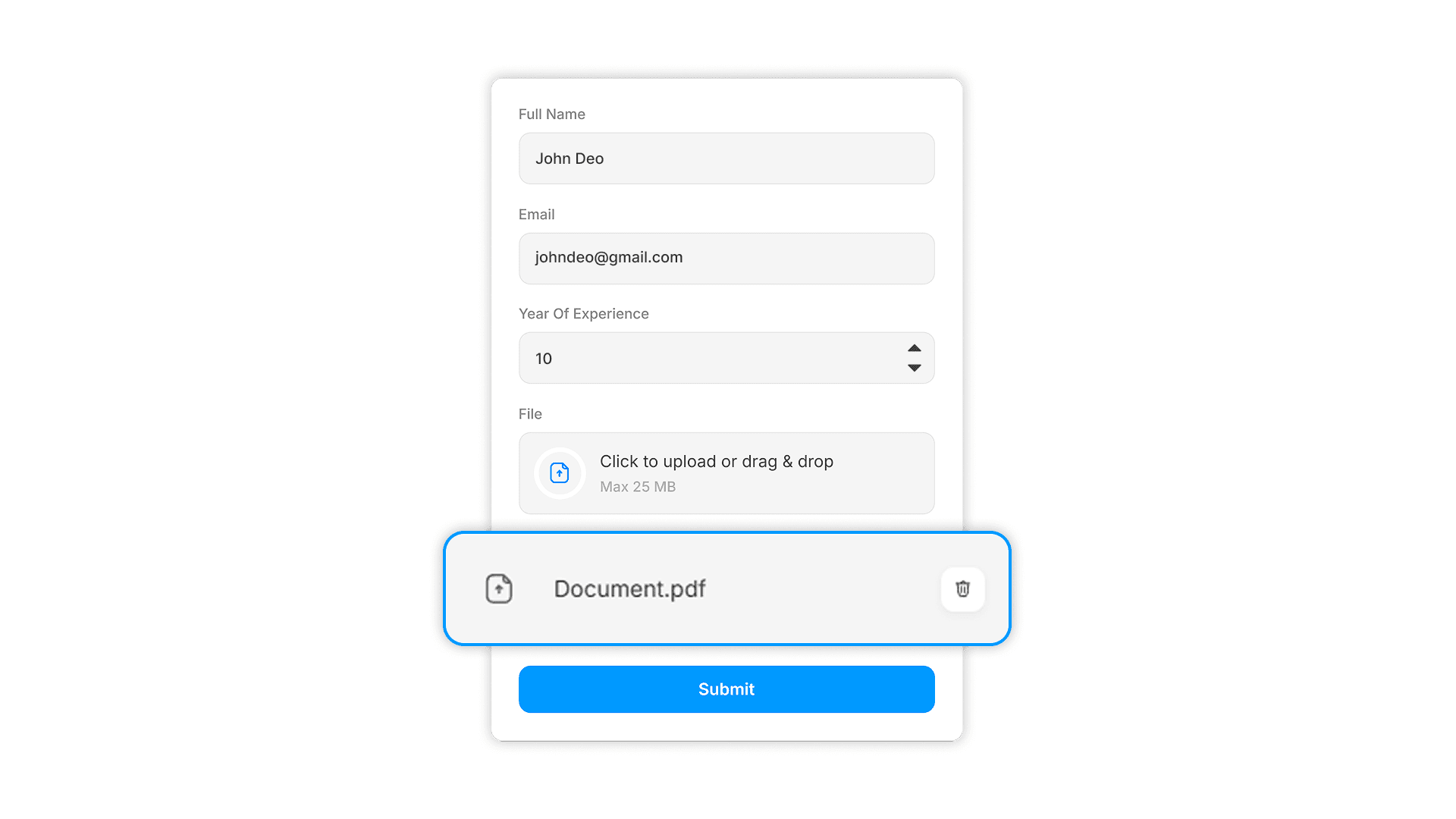 Think about where the upload fits best in the user’s flow. Often, it comes after basic details so people know who they are submitting as before sending files. For example: