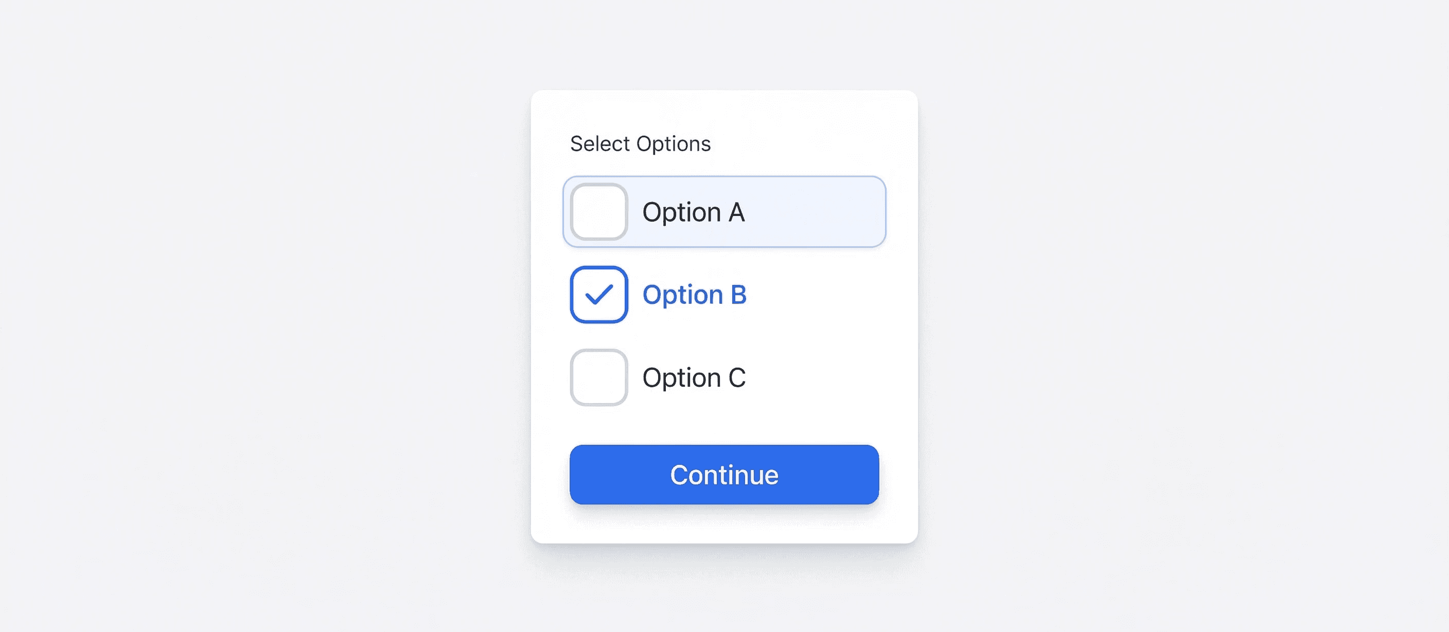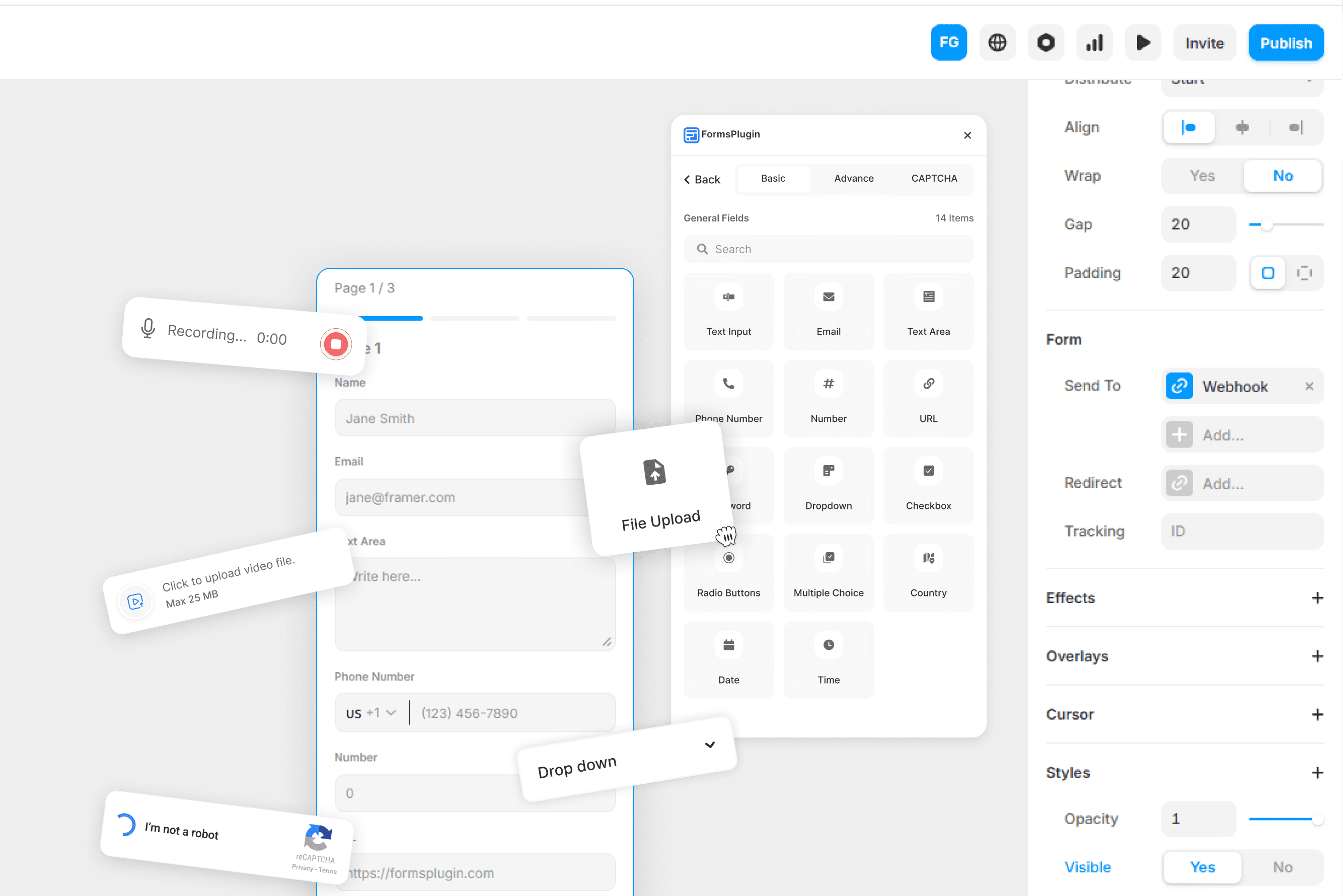 Add text, email, number, dropdown, and selection fields to create clean, structured native forms inside Framer.